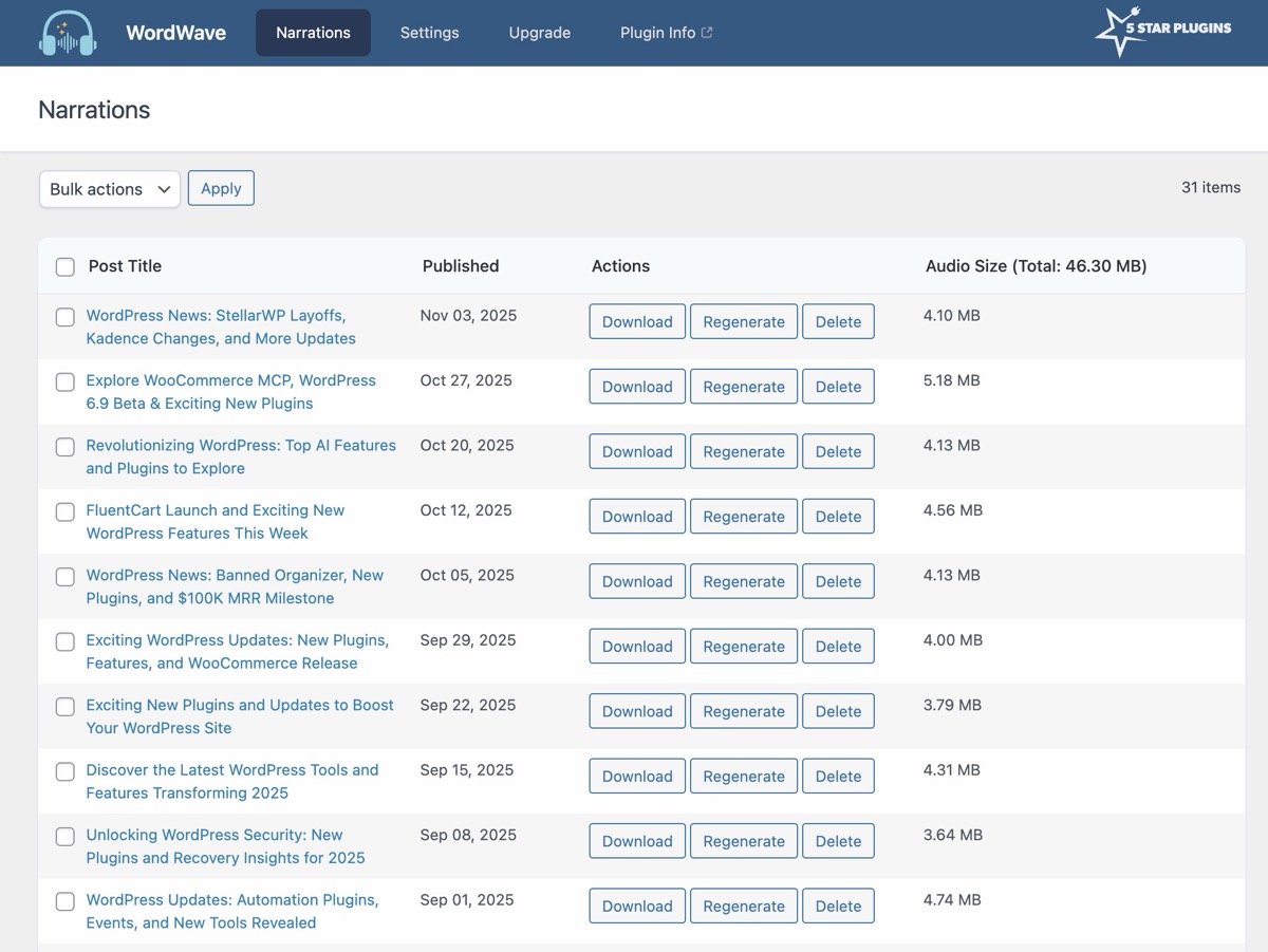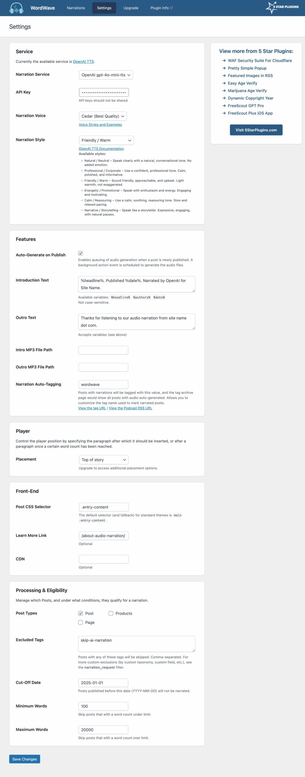 WordWave auto-generates audio and displays the player everywhere you specify (posts, custom post types, products, or pages). It will add TTS narration to existing and new items. If automation is not your speed, you can opt to generate each one manually. The player will not display where audio does not exist or on posts containing an exclude tag.